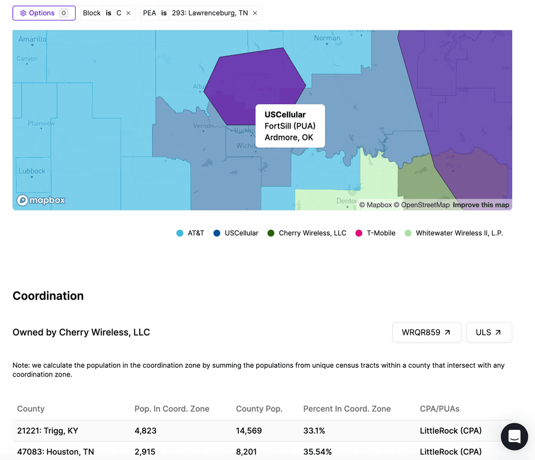 - Calculating Population Coverage: A more accurate representation of the spectrum's availability helps operators identify high-impact areas and make strategic decisions about their network deployments. To view population requiring coordination we provide a national view showing percent covered for all blocks and PEA's, and you can narrow you search by selecting a specific block or PEA, or searching by company.